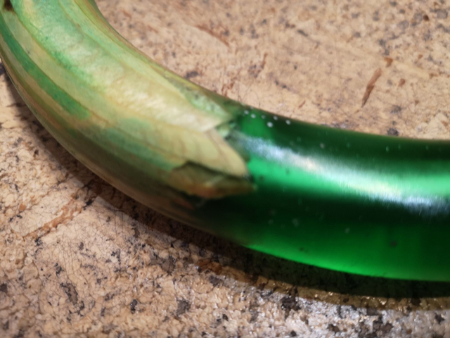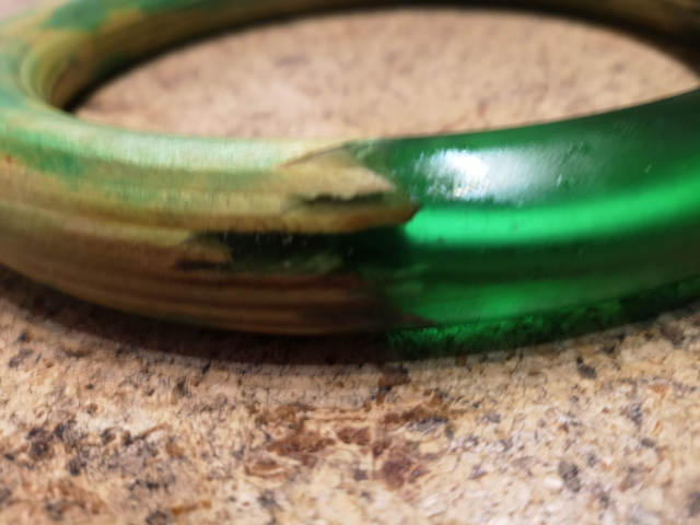 Grün abgesetzt , im Epoxidharz ist im Kern eine Metallverstärkung fest eingegossen und im Holzteil verankert.